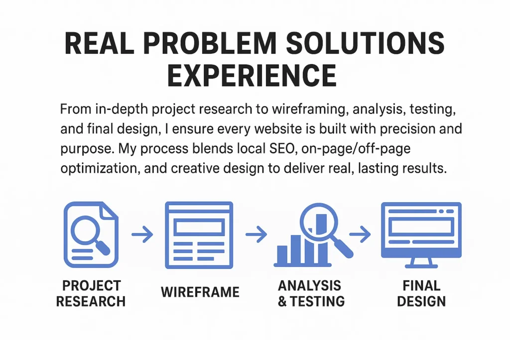 From in-depth project research to wireframing, analysis, testing, and final design, I ensure every website is built with precision and purpose. My process blends local SEO, on-page/off-page optimization, and creative design to deliver real, lasting results.”
